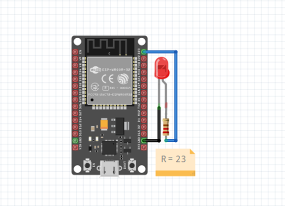 - Saat ESP32 dinyalakan, LED merah yang terhubung ke salah satu pin digital akan dinyalakan selama 5 detik.
