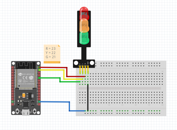 Proyek ini adalah simulasi sistem lampu lalu lintas sederhana menggunakan mikrokontroler ESP32. Dalam proyek ini, menggunakan modul traffic light atau bisa juga dengan menggunakan tiga buah LED digunakan untuk merepresentasikan lampu merah, kuning, dan hijau, yang dipasang pada pin digital 23, 22, dan 21.