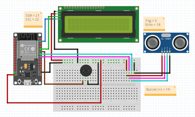 Proyek ini menggunakan ESP32, sensor ultrasonik HC-SR04, LCD I2C 16×2, dan buzzer untuk mengukur jarak benda di depan sensor. Nilai jarak ditampilkan di LCD. Jika jarak lebih kecil dari 10 cm, maka buzzer akan berbunyi sebagai peringatan. Proyek ini berguna untuk sistem peringatan jarak, seperti parkir sensor atau sistem deteksi objek.