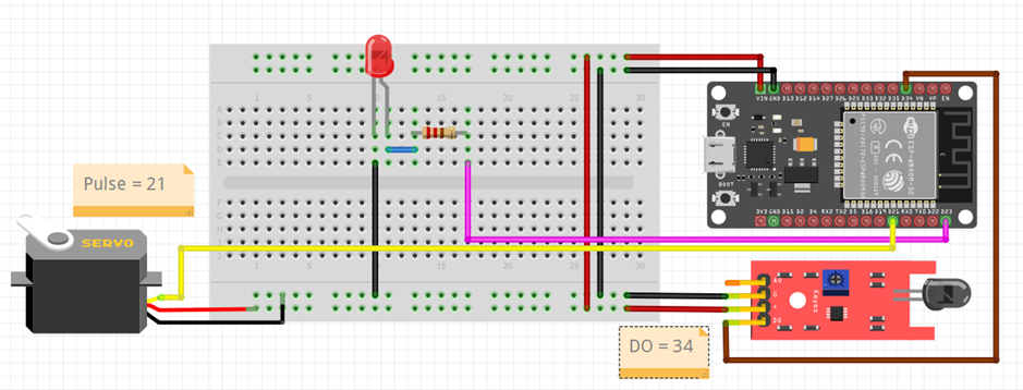 Proyek ini adalah sistem deteksi api otomatis menggunakan sensor api, ESP32, servo motor, dan LED. Ketika sensor mendeteksi api, servo akan bergerak untuk melakukan aksi (misalnya membuka katup pemadam) dan LED indikator akan mati. Jika tidak ada api, LED akan menyala sebagai penanda sistem standby.