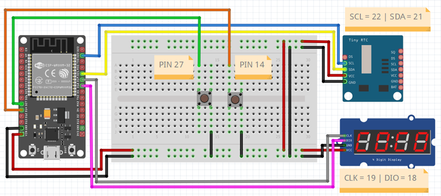 - Tombol yang terhubung ke pin GPIO 14 digunakan untuk menambahkan jam, dan tombol di GPIO 27 untuk menambahkan menit.